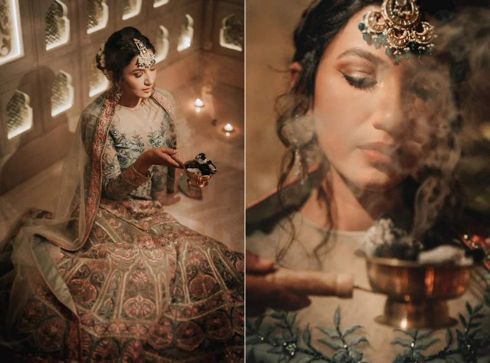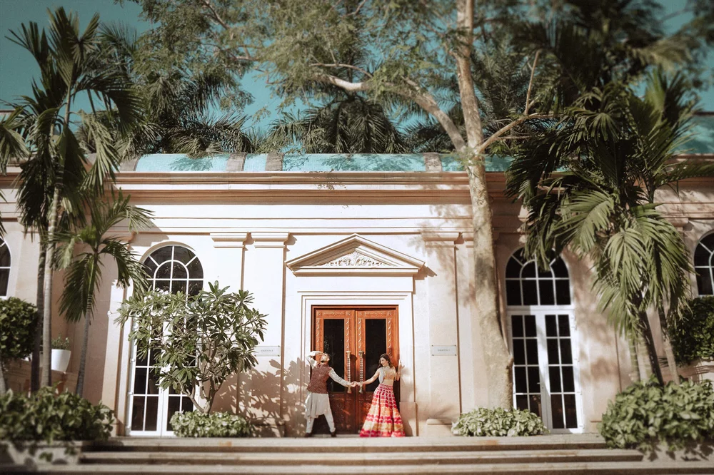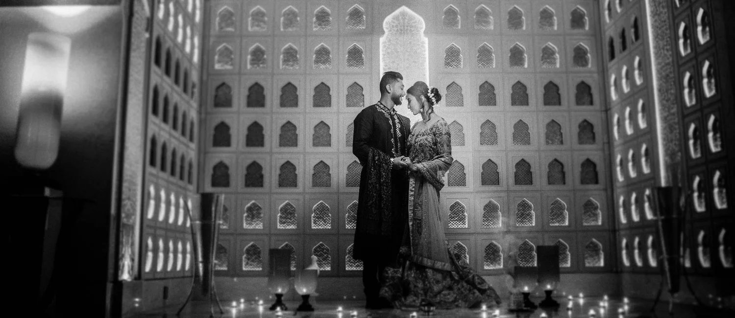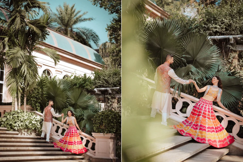 The pre-wedding photoshoot was shot keeping in mind the fun & vibrant personalities of Gauahar & Zaid without losing the essence & grace of their culture. The outdoor shoot was casual & candid amidst the green palm trees and bright blue skies at the ITC, Mumbai. The second half of the shoot was shot against a traditional Islamic backdrop lit up with candles while a subtle haze from lobaan (a fragrant balsamic resin) lent an element of surreality.