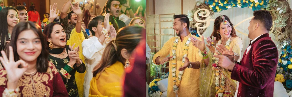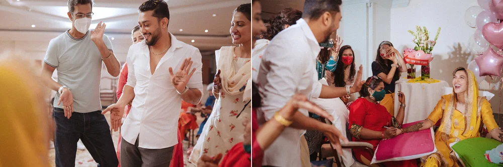 Surrounded by a tight group of family & friends, Gauahar applied mehendi on her hands & beautifully incorporated her to-be-groom, Zaid’s name. Half way through, he walked in and surprised her with balloons, flowers & a cake. He upped the comical quotient by entering with a tiara and a sash that read “Bride to be” before settling down with the Mehendi gang who insisted on writing the words ‘Gauahar ka Dulha’ (Gauahar’s groom) on his palm.